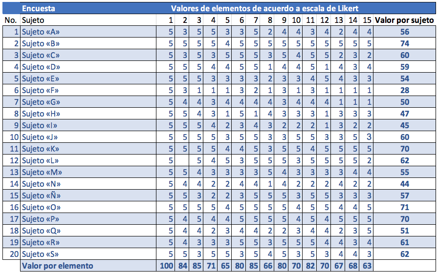 Haz el cálculo de cada ítem y sujeto con el signo de sumatorias automáticas (Σ). Obtendrás un resultado por cada entrevistado como el siguiente: