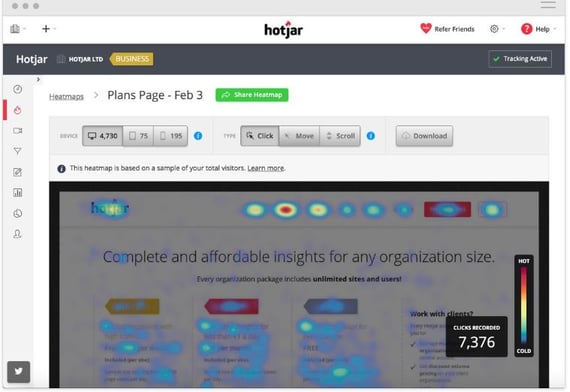 Hotjar es una de las herramientas de mapa de calor más populares. Te ofrece mapas de movimiento, clics y desplazamiento para comprender a profundidad el comportamiento de los usuarios. Además, cuenta con otra característica: grabación de visitas, con la que visualizarás exactamente las trayectorias.