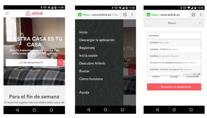Aspectos destacados: Airbnb siempre aparece en nuestros ejemplos de buenas prácticas. Nos encanta su uso de imágenes, la simplicidad, el CTA en la página principal y su integración con Google para la predicción de texto en la caja de búsqueda.