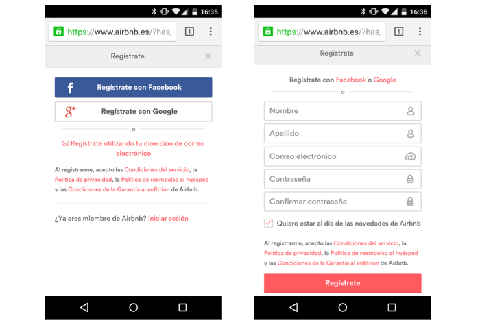 Aquí tenemos de nuevo el ejemplo de Airbnb donde ofrece al usuario varias opciones para registrarse: