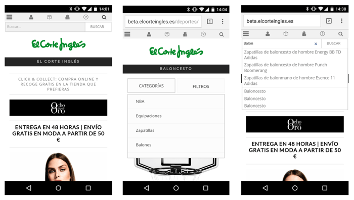 Aspectos destacados: El Corte Inglés es una página compleja para adaptar a móvil; su oferta de producto es extensa. Creemos que la combinación de un estilo minimalista junto con varias opciones de navegación y búsqueda predictiva hacen que sea una experiencia menos compleja que otros modelos de negocios similares. El uso de filtros y categorías es especialmente útil.