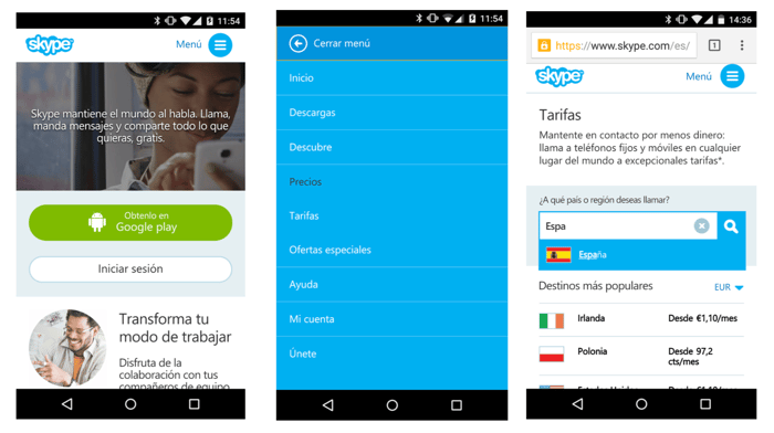 Si la simplicidad a la hora de diseñar páginas web es importante, en un diseño web móvil es requisito indispensable. El objetivo es crear una experiencia clara e intuitiva para cautivar al usuario y mantener su atención. Esto con el objetivo de que adquiera una prueba o una licencia en el caso de Skype.